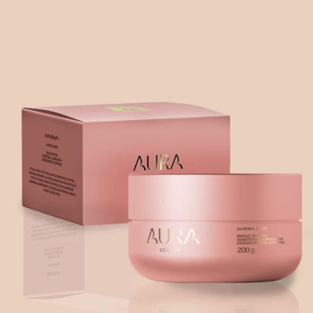 Magic Butter Aurora Shine é um creme corporal desodorizante com toque acetinado e brilho radiante. Com fórmula rica em manteiga de karité e vitamina E, hidrata profundamente, melhora a textura da pele e promove proteção antioxidante. Sua textura leve, à base de fosfolipídeos, proporciona rápida absorção e efeito “second skin”, deixando a pele perfumada, macia e visivelmente luminosa. Produzido no Brasil por Aura Beauty.como primer, preparando a pele para a maquiagem, ou como finalizador, garantindo um glow natural e uma pele com viço radiante ao longo do dia