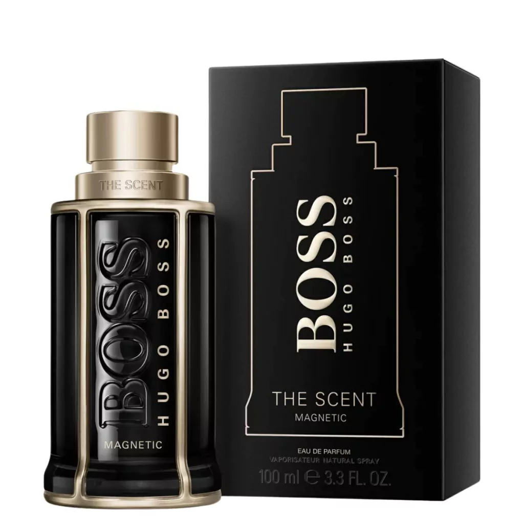 Um frasco de 100 ml de BOSS The Scent Magnetic for Him eau de parfum. Experimente o poder da sedução com BOSS The Scent Magnetic, uma fusão irresistível de baunilha preta e absoluto de farelo, apresentada em um frasco laqueado preto.